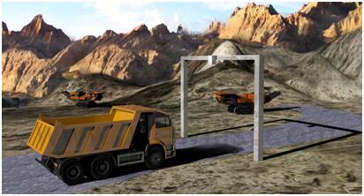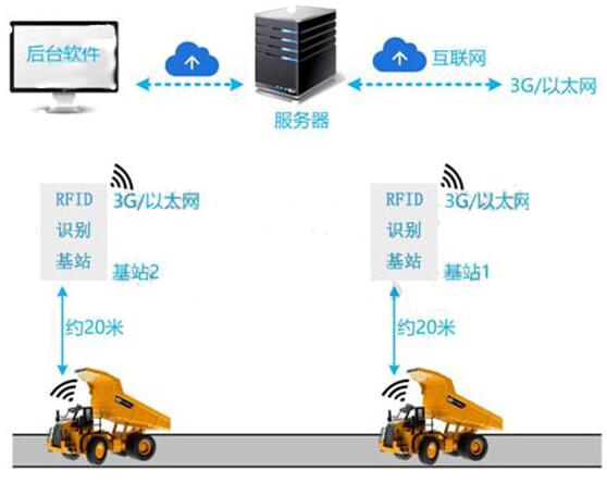 矿场现场较为空旷不易架设过多设备,本系统采用无线通信方式,在运输起点及终点进出口处各架设一个自动识别基站,车辆上安装有源车辆标签,则车辆通过进出口即可被设别,且系统可分析记录其进出状态,以此判断该车辆运输次数及当次运输所花费时间等等,整体系统采用无线通信,确保现场施工及维护的简便。
